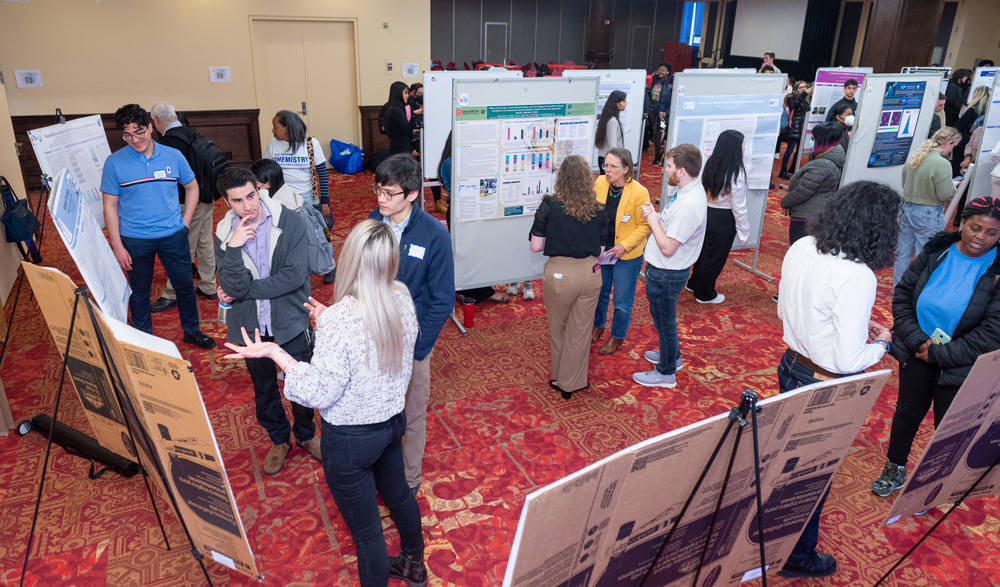 | Students from Queens College, LaGuardia Community College, Queensborough Community College, and York College presented their work at the borough-wide Undergraduate Research Symposium on Tuesday, April 2 in The Student Union. | Sana Khan, a biology student, explained her work. | |