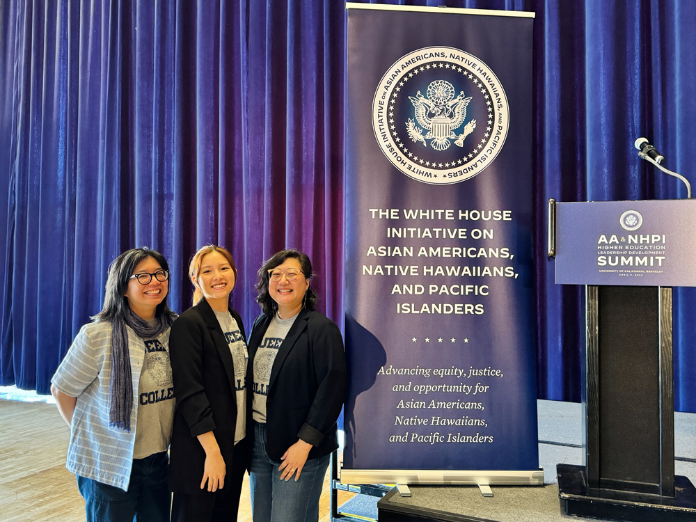 That day, members of the Queens College AANAPISI Project (QCAP) were in California, representing QC at the nation’s inaugural Asian American, Native Hawaiian and Pacific Islander Higher Education Leadership Development Summit, hosted at UC Berkeley by the White House Initiative on Asian Americans, Native Hawaiians and Pacific Islanders and the U.S. Office of Personnel Management. Later in the week, QCAP made a presentation at the annual Asian Pacific Americans in Higher Education (APAHE) conference in Oakland. | From left: QCAP Co-Director Amy Wan (English), QCAP Program Coordinator Annabelle Park, and QCAP Director Caroline K. Hong (English) | |