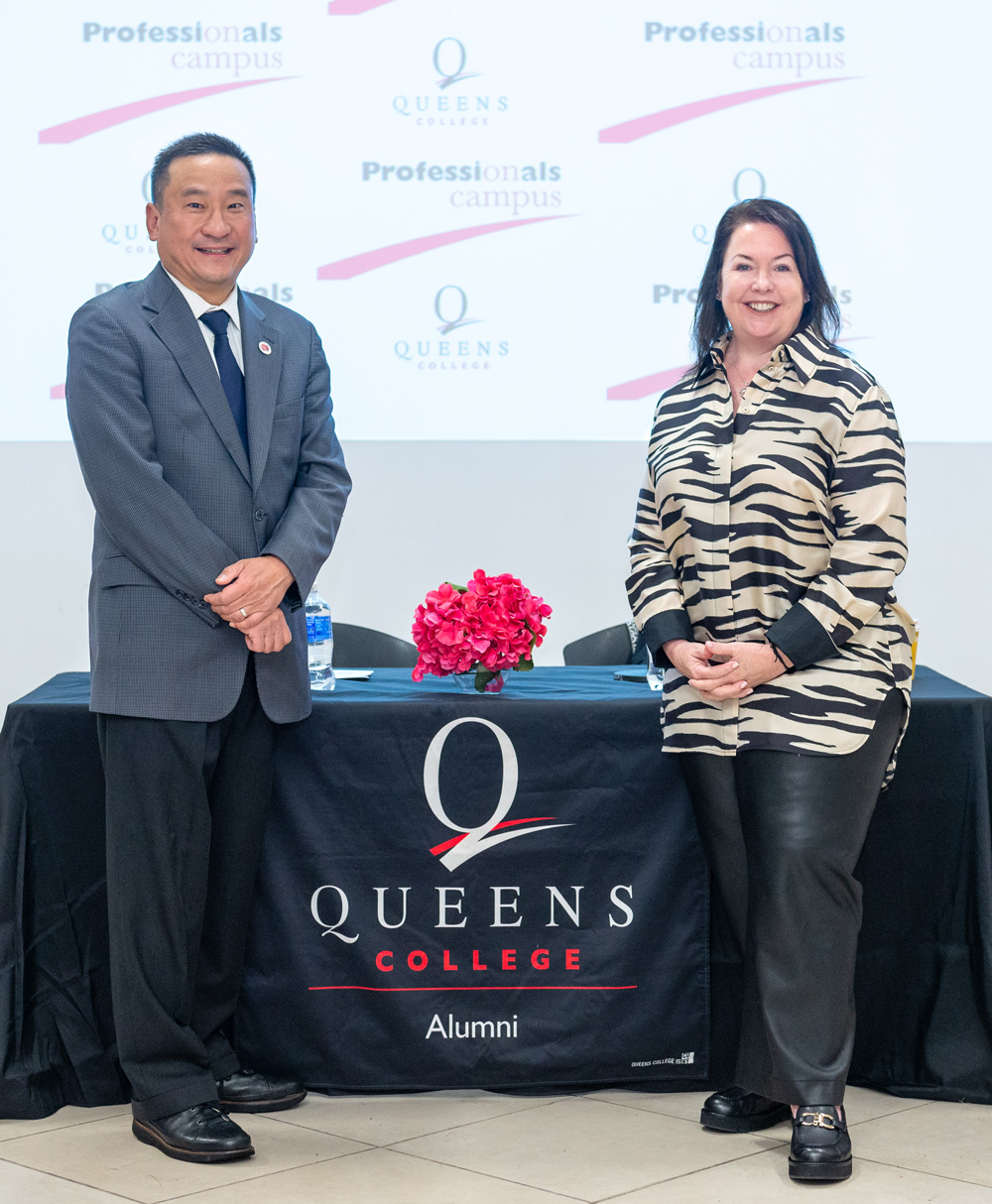 Stephanie Miller ’91—president, chief executive officer, and board director at Hazeltree, a company that provides innovative cloud-based treasury and liquidity solutions—shared insights from her career on Wednesday, April 3, through Professionals on Campus. Miller, seen here with President Wu, has over 30 years of experience in financial technology and services, modernizing global target operating models and driving profitable, sustainable growth. Her resume includes positions at Intertrust Group, a provider of specialized administration services for private capital managers and hedge funds; J.P. Morgan; and Citco Fund Services. Miller holds a bachelor’s degree in accounting from QC. Joan Nix (Economics) moderated the event, hosted by the Office of Institutional Advancement. | |