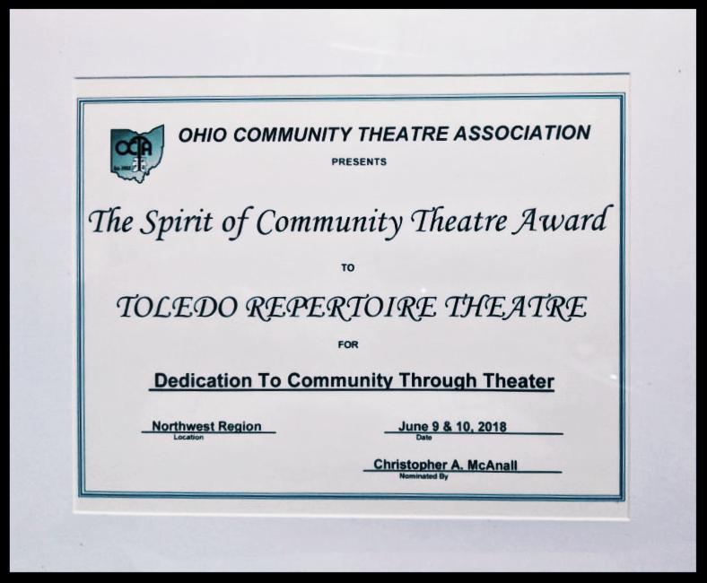The Toledo Repertoire Theatre is proud to announce that on June 10th we were presented with the "Spirit of Community Theatre" award at the Ohio Community Theatre Association (OCTA) regional conference!