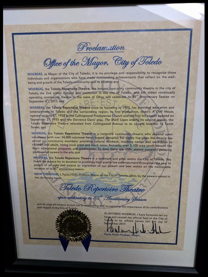On September 15th, the Toledo Rep received a hand delivered proclamation from Mayor Paula Hicks-Hudson and the City of Toledo congratulating the theatre on 85 wonderful seasons and for their artistic contributions to the city of Toledo!