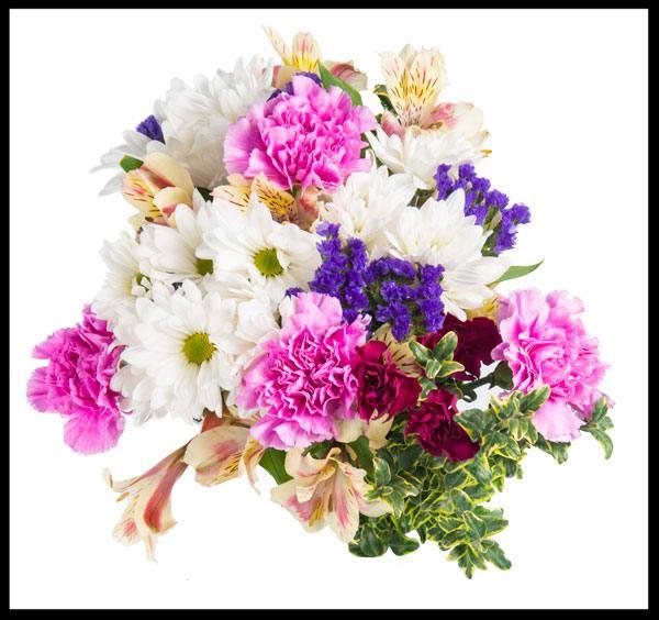 A hand-tied bouquet of fresh seasonal flowers and 3 roses.