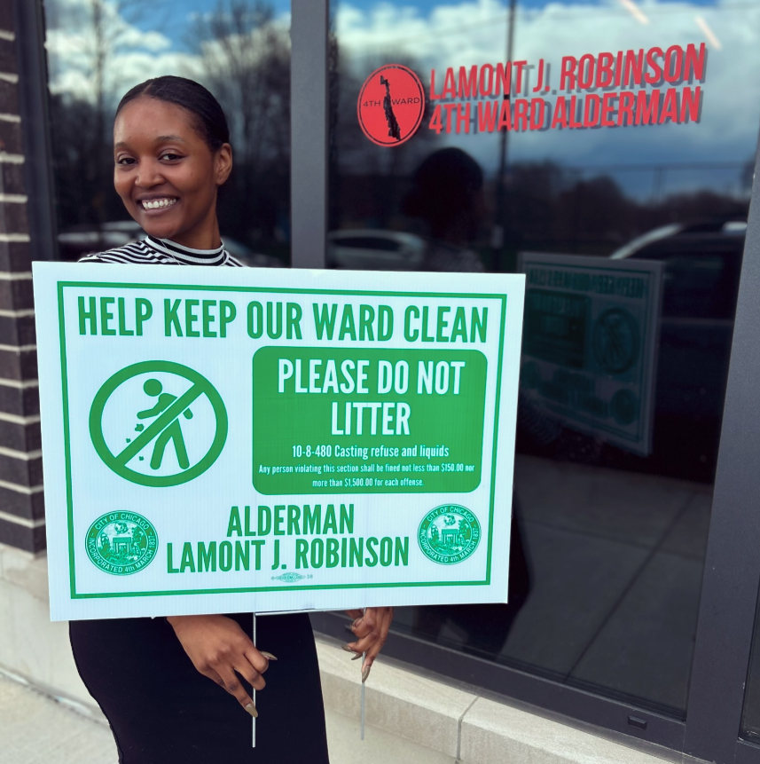 Free "don't litter" signs are now available for pickup from my office. My office is located at 928 E 43rd St., and it is open Monday–Friday, 9 a.m.– 5 p.m.