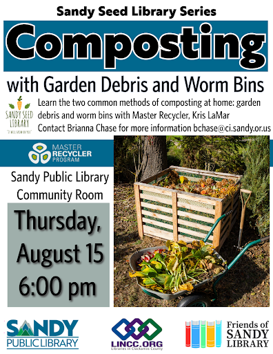 Join us on August 15th from 6:00 to 7:00 p.m. at the Sandy Library Community Room where Master Recycler Kris LaMar will deliver a presentation on composting with garden debris - an easy and cheap way to build a strong and healthy garden!