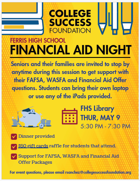 Do you still need to submit FAFSA? Have you received an email that your FAFSA has an error or missing signature? Have you received financial aid information from colleges that you do not understand? All are welcome to come to our financial aid night to get help and questions answered. Dinner (Panda Express) provided!