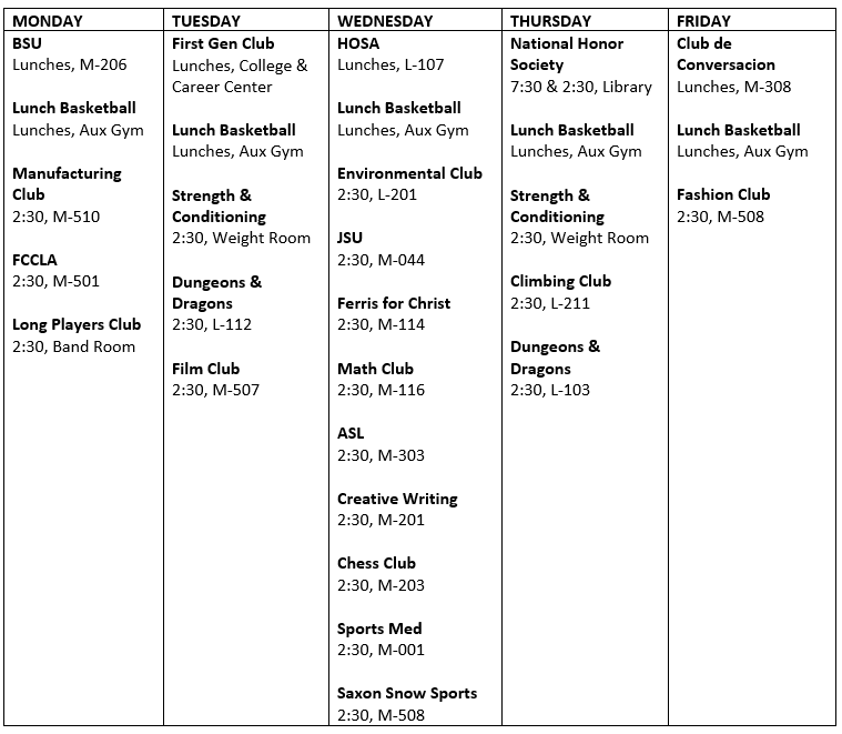 The Advisory period on Monday, April 29 will be a designated time for students to engage in extracurricular clubs. After watching the student-produced Ferris Information Network news show, students can meet with their club advisors and fellow club members. This provides access for students who may not be able to attend after-school club meetings.