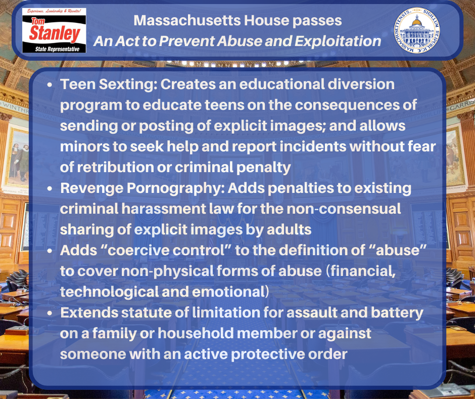 Rep. Stanley and members of the House passed legislation that combines several separate legislative initiatives into one bill that will help to prevent abuse and exploitation, while also enhancing protections for survivors. The legislation addresses teen sexting and image-based sexual assault, commonly referred to as “revenge porn;” expands the definition of abuse to include coercive control for the purposes of obtaining a restraining order; and extends the statute of limitations for certain domestic violence offenses from six years to 15 years.