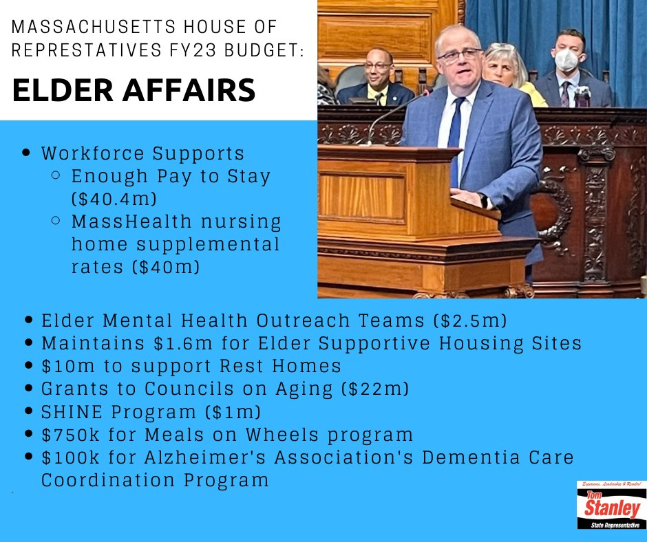 Rep. Stanley, Co-Chair of the Committee on Elder Affairs, is thrilled to announce that the House of Representatives passed a Health and Human Services and Elder Affairs consolidated amendment to the FY23 Budget (H.4700). This amendment will provide much-needed funding to programs and services that support the state’s aging population. The budget makes great strides in supporting the essential workforce which provides direct care in nursing facilities and in the home.