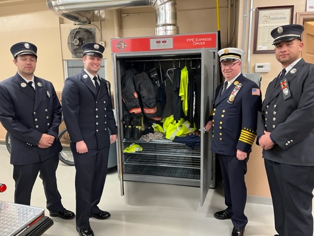 The officers of Riverside Hose in front of a new grant-funded PPE dryer: (L to R) Logan Spector, Captain Scott Weaver, Jr., Pat Derivan, Sr, Pat Derivan, Jr. | |