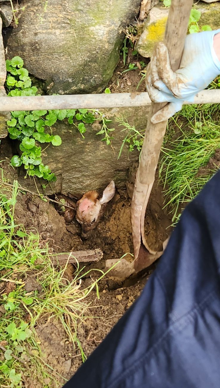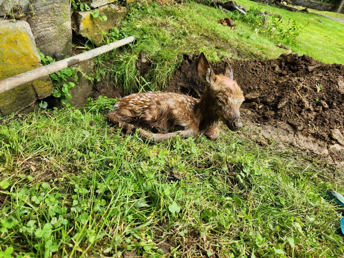 Often our public service professionals go well beyond the expectations of their job title. Today, at 12:30pm, after the heavy rains, the Department of Public Works was notified of a newborn fawn caught in a sink hole under a stone wall on the Mercy College property on E. Sunnyside.