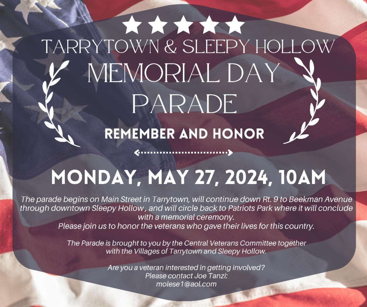 Please join us to honor the men and women who have given their lives for our country by participating in the Memorial Day Parade in Tarrytown and Sleepy Hollow and the ceremony in Patriots Park to follow. The Parade will begin at 10am on Main Street in Tarrytown, will continue down Rt. 9 to Beekman Avenue and will loop back over to Patriots Park.