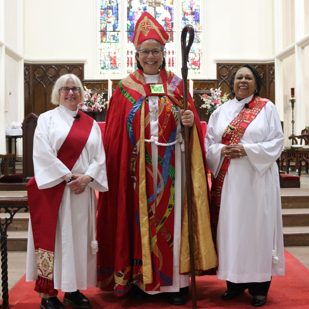 The Rev. Deacon Annie Pike and the Rev. Deacon Jackie McLeod with Bishop Hughes after their ordination to the Vocational Diaconate last Saturday, April 13, at Trinity & St. Philip's Cathedral. | |