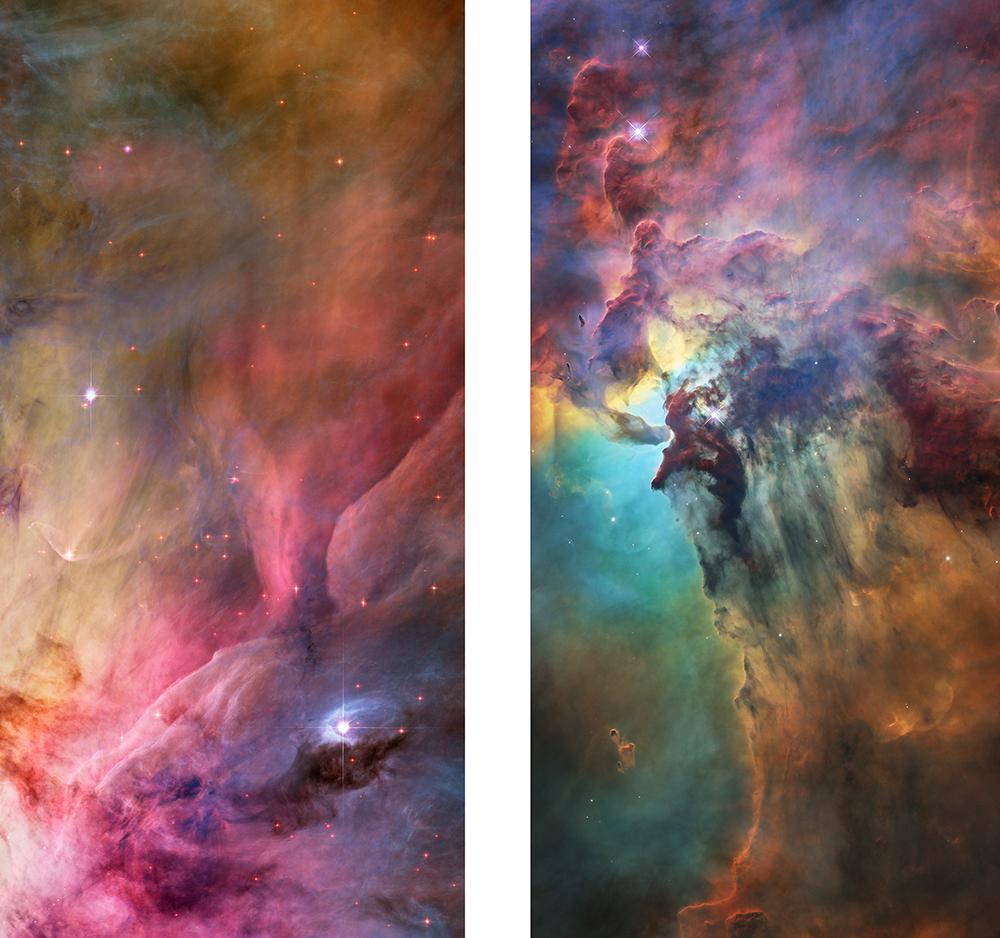 Two fabric reproductions of NASA Hubble Space Telescope imagery are on display in the sanctuary. One is Orion Nebula, a swirl of intergalactic gases creating a colorful palette of pink, gold and deep purple with distant stars shining through. The second image is of the Lagoon Nebula. This darker image shows a cloud of deep red and orange over a background of bright turquoise with light from a star shining through.
