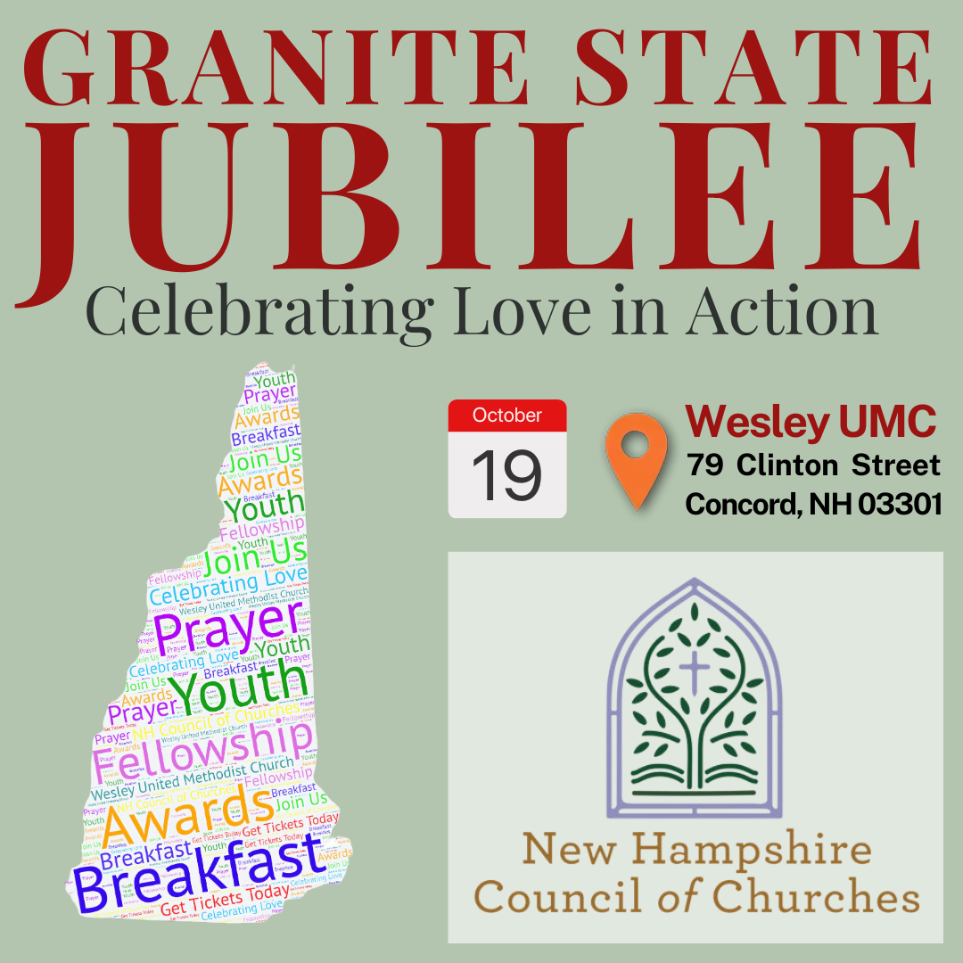 The Granite State Jubilee is set to take place on October 19, 2024. This event is the Council's return to an annual interfaith gathering featuring keynote speaker Rev. Liz Theoharis. Enjoy a breakfast buffet, prayer stations, refreshed annual awards (nomination info below), and more. Youth are invited to participate in a Youth Delegation.