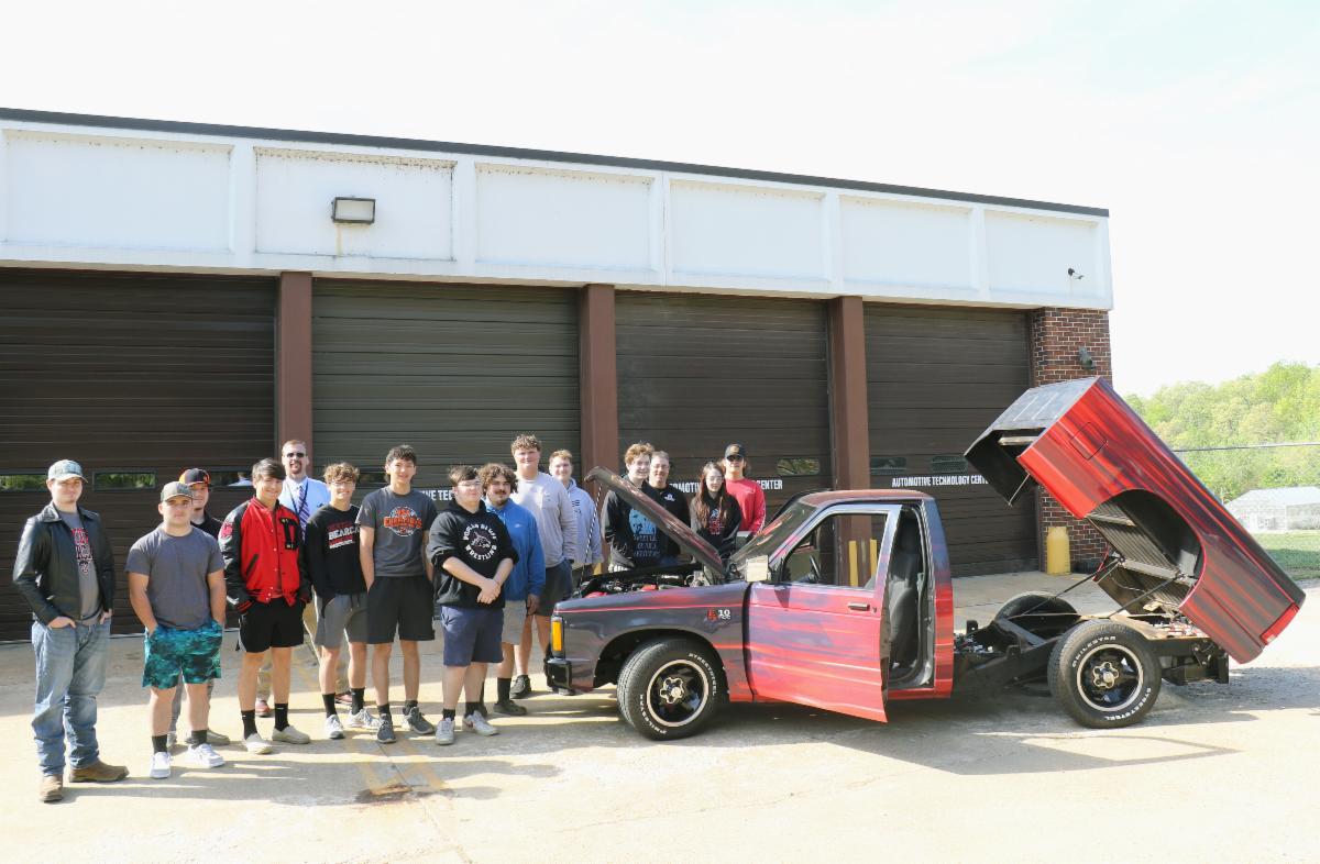 Above: The auto tech class at the Technical Career Center, along with Director Charles Kinsey and instructor Steven Layman, poses beside the converted Chevrolet S-10 on Wednesday, April 19.
