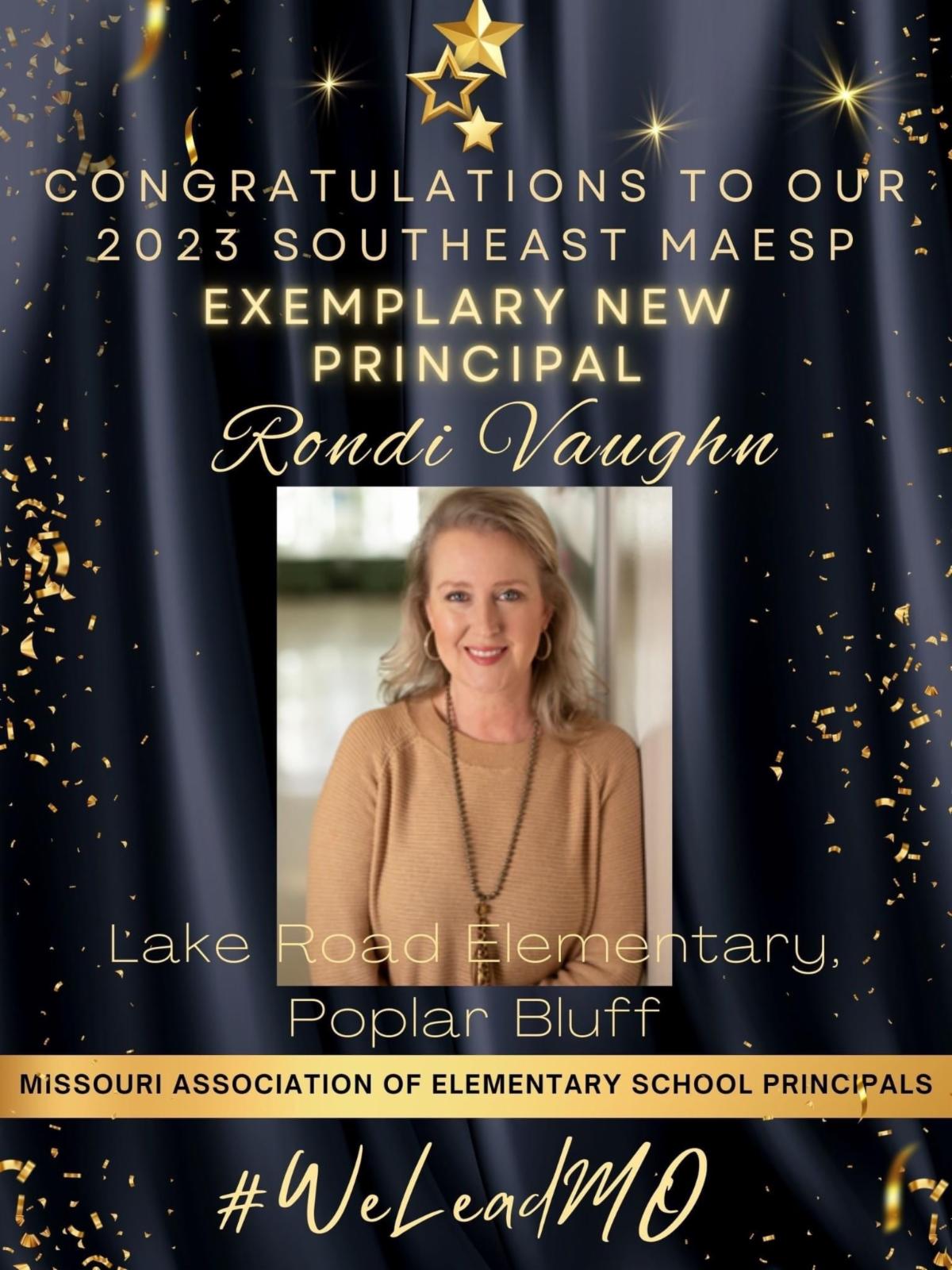 Rondi Vaughn, who is in her third year leading Lake Road Elementary, has been named Southeast Region’s 2023 Exemplary New Principal by the Missouri Association of Elementary School Principals. She, along with 10 colleagues across the state, will be recognized this evening during the annual MAESP Leadership Conference at Osage Beach.