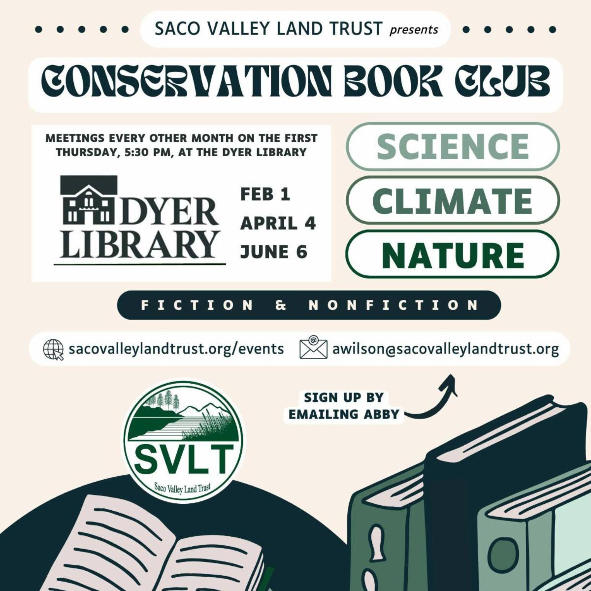 Saco Valley Land Trust and Dyer Library/Saco Museum are teaming up to bring a new Conservation Book Club to Saco, with the first meeting coming up tonight, February 1st! Future book club meetings will take place on April 4th and June 6th.
