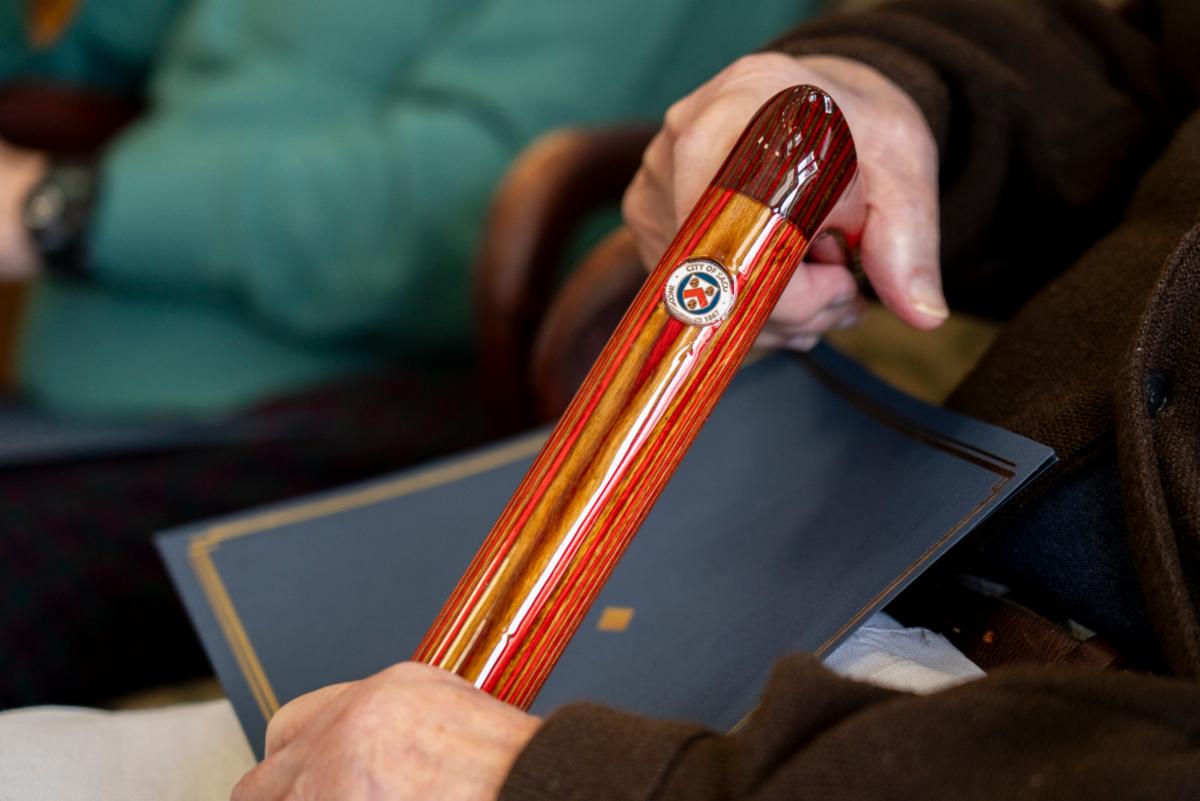 The canes, made and gifted by Saco local Ernie Merritt, are custom and unique creations that come with a branded engraving and the City of Saco seal, historically presented by Saco's Mayor.