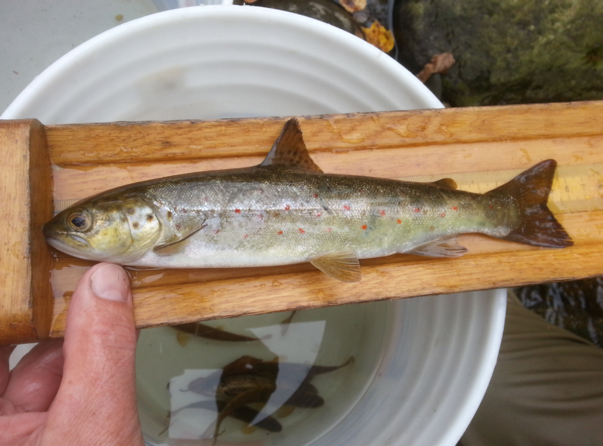 Last month's mystery fish is called a SamBrown (Hybrid between an Atlantic Salmon and Brown Trout). SamBrowns are probably a little more common than you would expect. In European rivers with sympatric populations of Atlantic Salmon and Brown Trout they typically represent 1 – 3% of the members of the genus Salmo. We‘ve documented them in several tributaries of the Farmington. Typically in waterbodies that are both heavily stocked with Atlantic Salmon fry and have large populations of wild Browns. The first place we documented them was in East Branch Salmon Brook in Granby. Their parentage was verified using genetic analysis. The cross typically occurs when a sexually precocious male salmon parr spawns with a female Brown Trout. Based on our sampling virtually 100% of the male parr are thought to mature by age 1+. In European rivers most sampled Sambrowns have had Brown Trout mitochondrial DNA, which probably means that they were also derived from crosses with sexually precocious male salmon parr.