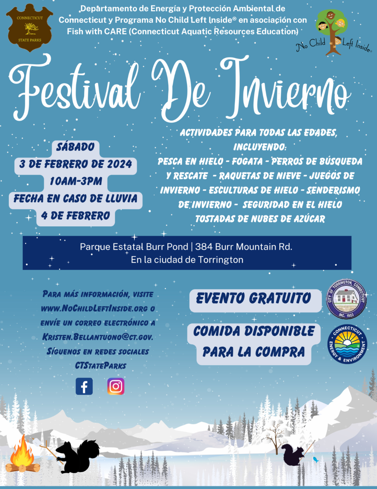You can come ice fishing with us at the 18th Annual No Child Left Inside® Winter Festival at Burr Pond State Park, Torrington, where we will provide loaner equipment, bait, and instruction (subject to safe ice conditions). The festival is 10 a.m. to 3 p.m. Saturday, Feb. 3 with a rain date of February 4. The event is free and no registration is required.