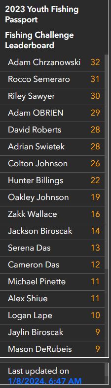 Congratulations to the following anglers who spent an amazing amount of time fishing to take top honors in the 2023 Youth Fishing Passport - Fishing Challenge. This was the first year with the expanded list of species and many anglers rose to the occasion. The contest is on for 2024 and there is already multiple catches. Let's go fishing!