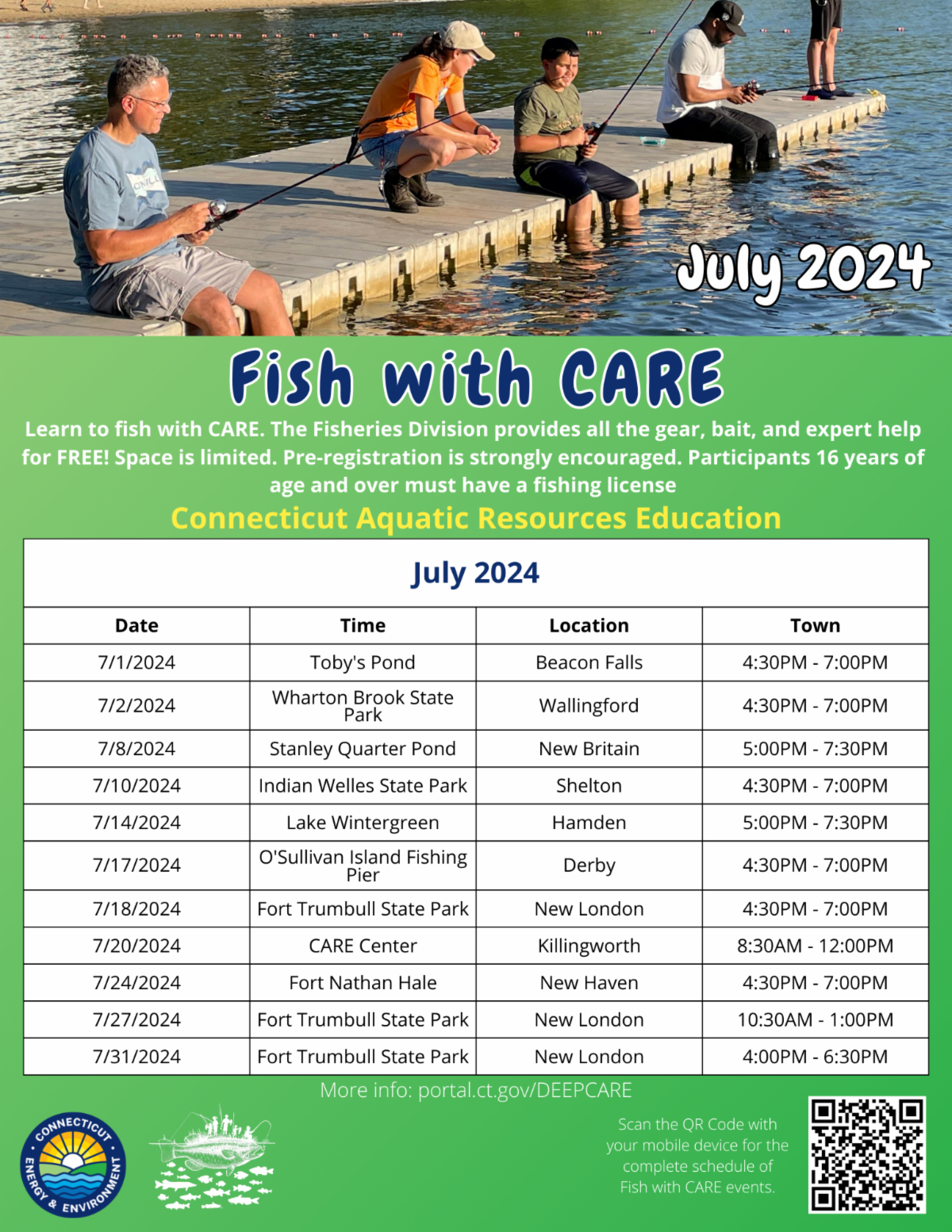 The Fisheries Division – Connecticut Aquatic Resources Education Program (CARE) is seeking volunteers to join our team of certified Fishing Coaches! FISH with CARE program hosts classes and events all over the state where we teach basic fishing skills to adults, families, and youth. FISH with CARE coaches work with Fisheries staff to educate and engage the public in the outdoors through the sport of fishing. If you are interested in sharing your love and knowledge of fishing while creating the next generation of environmental stewards, consider joining our Fishing Coach team! Our next certification training will be offered in spring of 2024, information to get involved can be found HERE!