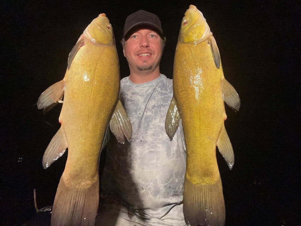 Tench will commonly grow to 16 inches, but larger specimens are out there as shown in the photo below of DEEP Fishing Coach John Danowski holding two exceptionally large tench he caught. John offers the following tips to those looking to target tench:
