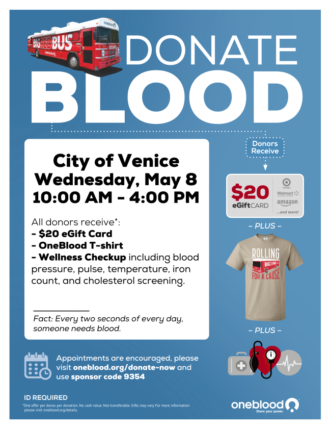 The Venice Community Center, located at 326 Nokomis Ave. S. on the island, will have seating for 200 people to listen to speakers, and standing room for more. Vendors will be offering invaluable hurricane- and storm-related information, products and services, and raffles and other giveaways are planned. At the City of Venice table, there will be a raffle for three weather radios. Food and drinks will be available for purchase. Interested in being a vendor? Limited spaces are available by calling 941-207-1220 by Friday, April 26.