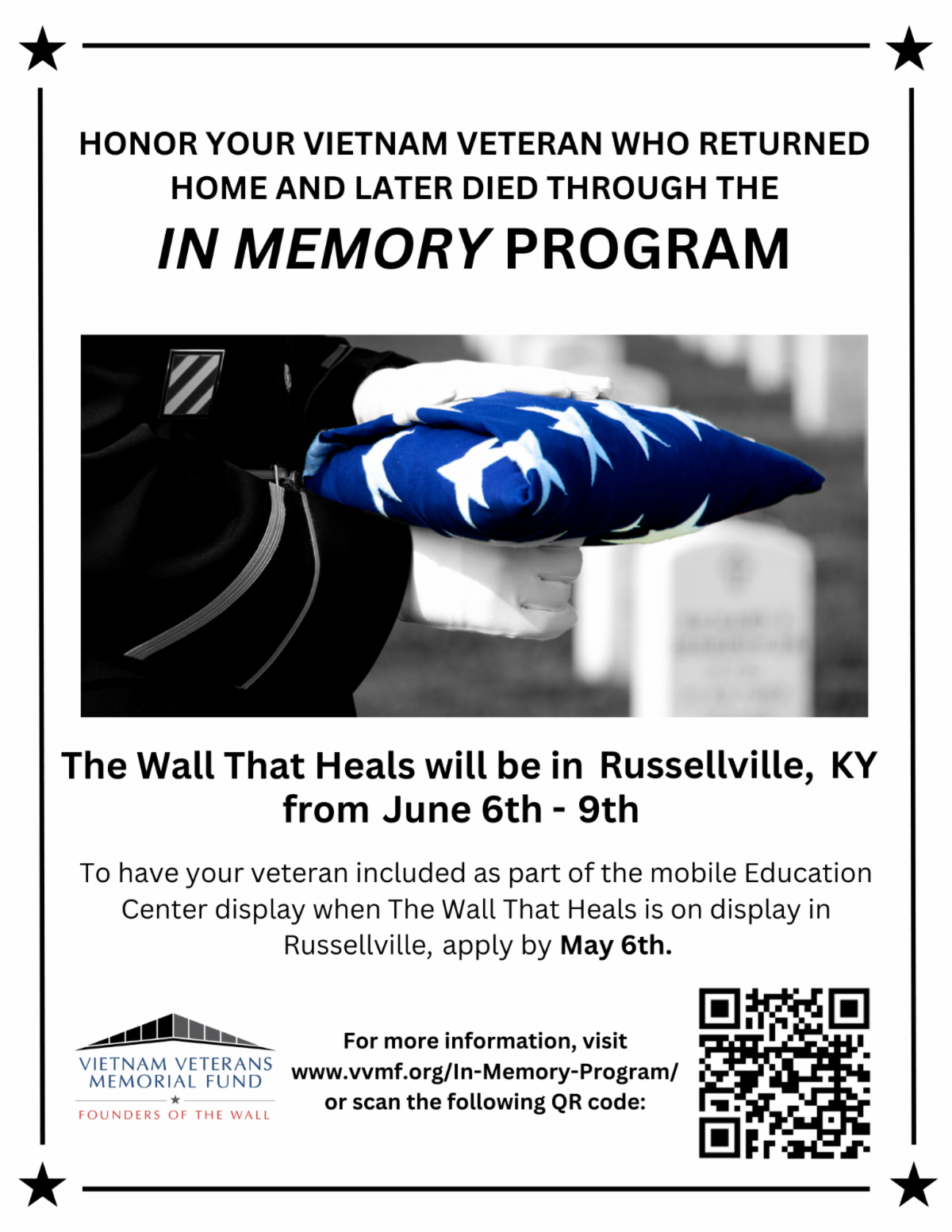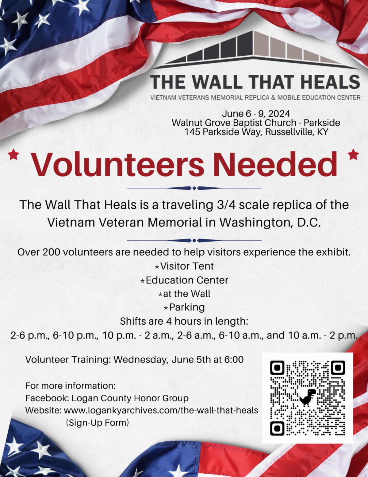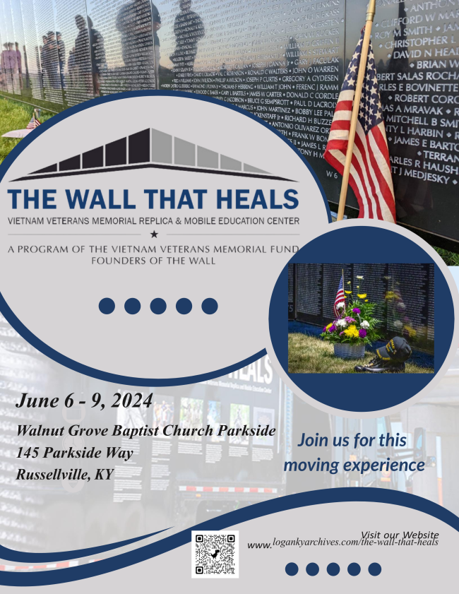 June 6-9: The Vietnam Veterans Traveling Wall That Heals will be in Logan County @ The Walnut Grove Park Side Location off the bypass in Russellville, Volunteers & Sponsors can sign up by calling 270-726-8179