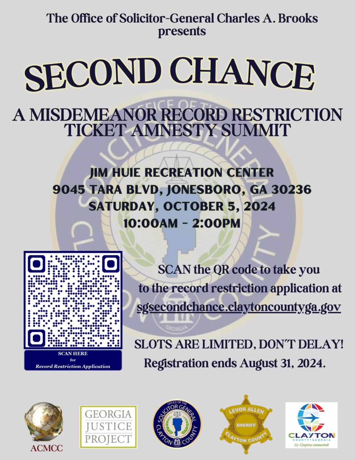 (Jonesboro, Georgia) – The Clayton County Solicitor’s Office is pleased to announce the opening of registration for its upcoming Record Restriction Fair. This event is the culmination of the joint efforts of the Clayton County Solicitor’s Office, The Georgia Justice Project, the Clayton County Sheriff’s Office and the Association of Christian Ministers of Clayton County. This event aims to assist eligible individuals in clearing their criminal records, providing them with a fresh start and better opportunities for employment, housing, and education.