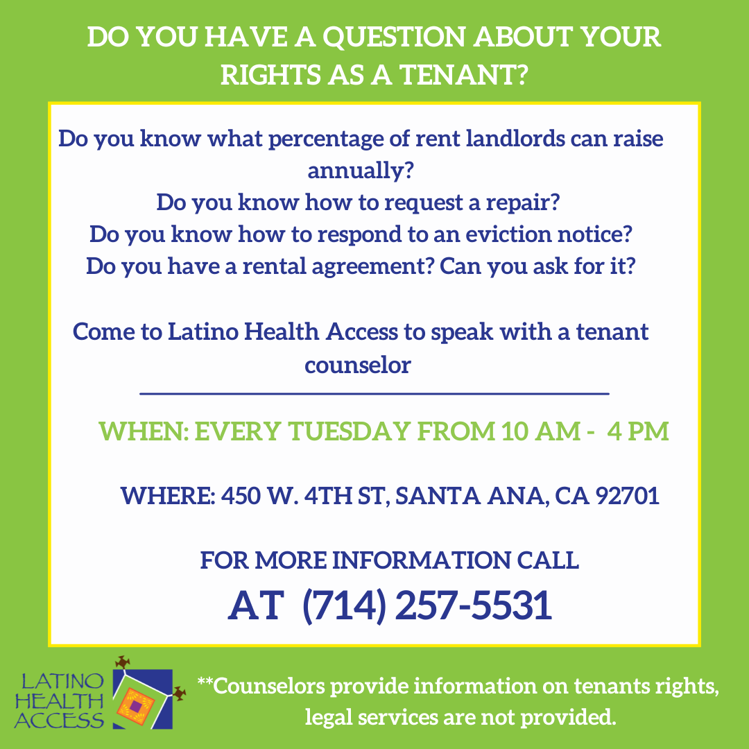 Adelaida is a 46-year-old Latinx migrant woman who lives in Santa Ana, CA. She is also a single mother of 4 children, and a survivor of domestic violence. Adelaida first heard about LHA through a tenant counseling flyer she received at a community center in her neighborhood. Given the urgency of her housing situation and constant harassment by her property owner, Adelaida sought LHA’s help the same day she received the flyer. The financial hardship caused by the COVID-19 pandemic led Adelaida to accumulate rental arrears. Due to Adeilada’s living situation, an LHA tenant counselor informed her about Santa Ana’s emergency rental assistance program, and other internal LHA resources such as the food bank, and her tenant’s rights. During their conversation, the LHA tenant counselor helped her sign and submit her emergency rental assistance application and invited her to attend CEA’s meetings, where she could continue learning about her rights and work with other tenants to find solutions to the issues of housing insecurity, evictions and the social determinants of health they experience.