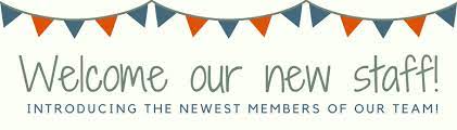Image above: Blue and green pennants hanging above a sign that reads, "Welcome Our New Staff! Introducing the newest members of our team!" | |
