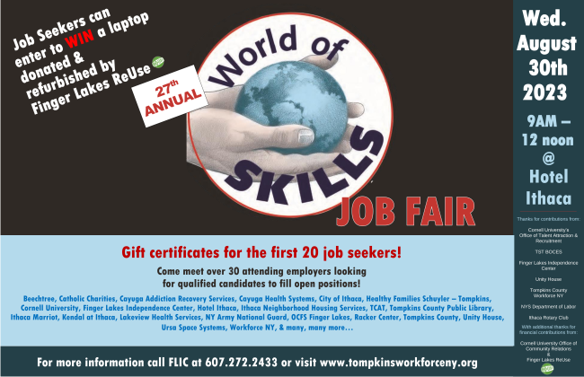 Poster Above: 27th Annual World of Skills Job Fair. Wednesday, August 30, 2023, 9 AM to Noon at the Hotel Ithaca. Job seekers can enter to win a laptop, donated and refurbished by Finger Lakes ReUse. Gift certificates for the first 20 job seekers! Come meet over 30 attending employers looking for qualified candidates to fill open positions!