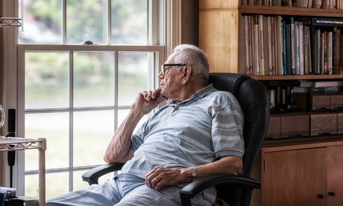 Picture Above: Photo of older adult white man with glasses and grey and white striped shirt sitting in chair and looking out a window with hand on his chin. | |