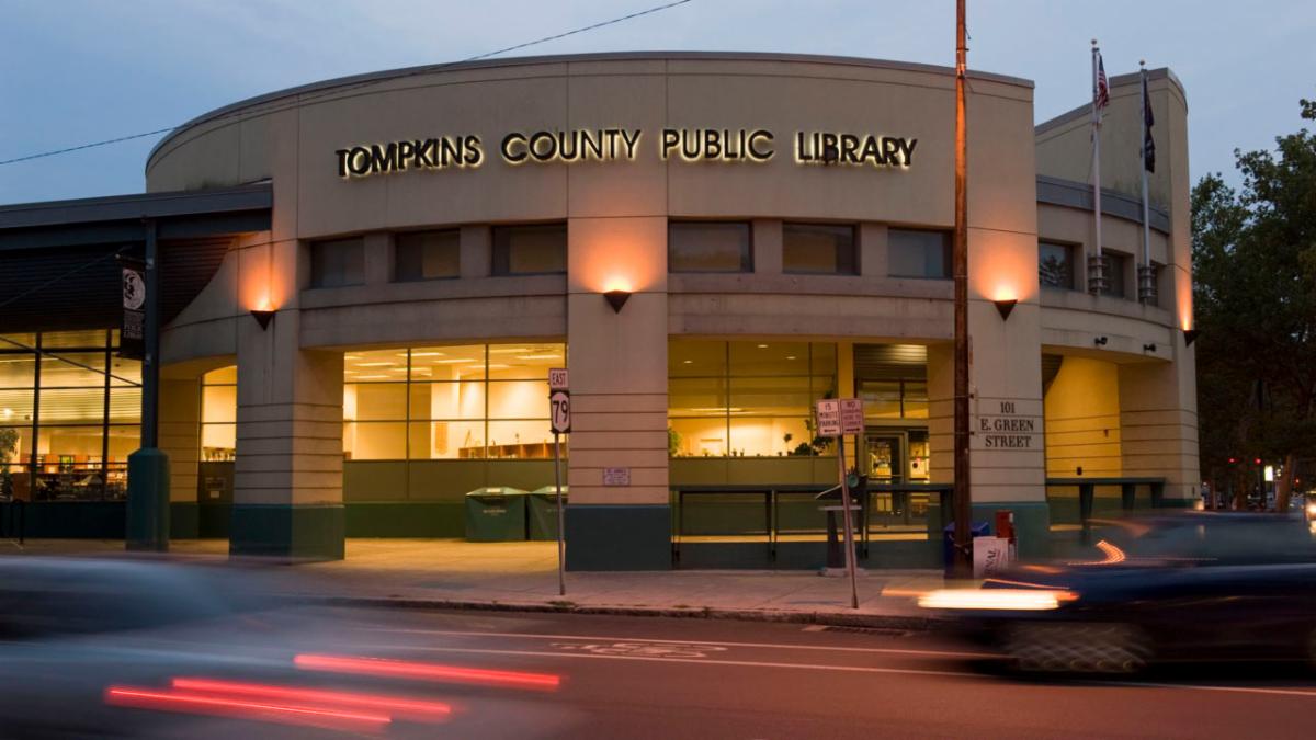 | Image Above: Picture of Tompkins County Public LIbrary in the evening with the lights on. | |