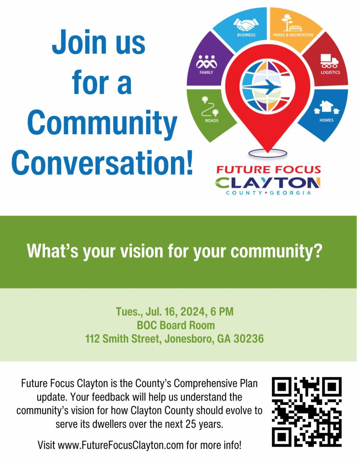 (Clayton County, GA)- The Clayton County Board of Commissioners will hold a public hearing on the Future Focus Clayton County Comprehensive Plan update on Tues., July 16, 2024, at 6 p.m. in the Board of Commissioners Board Room, 112 Smith Street, Jonesboro, GA 30236.