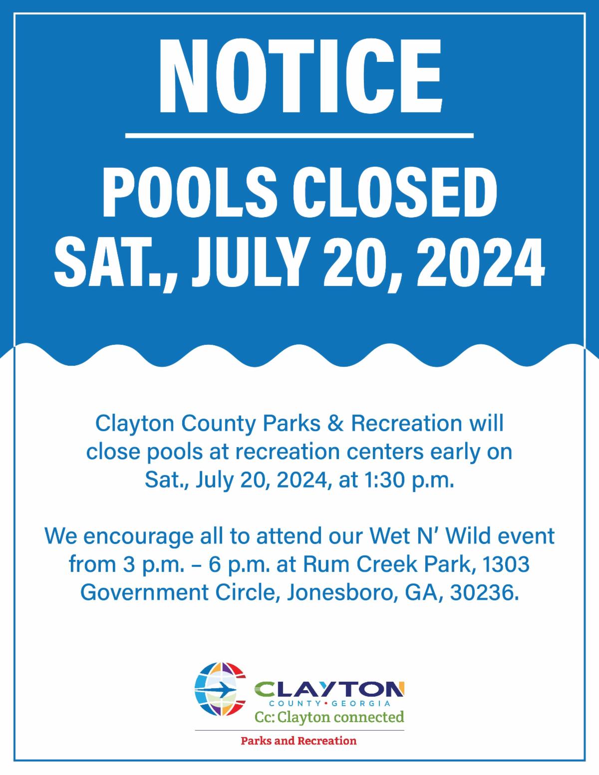 (Clayton County, GA)- Clayton County Parks and Recreation will close pools at recreation centers early on Sat., July 20, 2024, at 1:30 p.m. Patrons are encouraged to attend the July is... Wet N' Wild event from 3 p.m.- 6 p.m. at Rum Creek Park, 1303 Government Cir., Jonesboro, GA 30236.