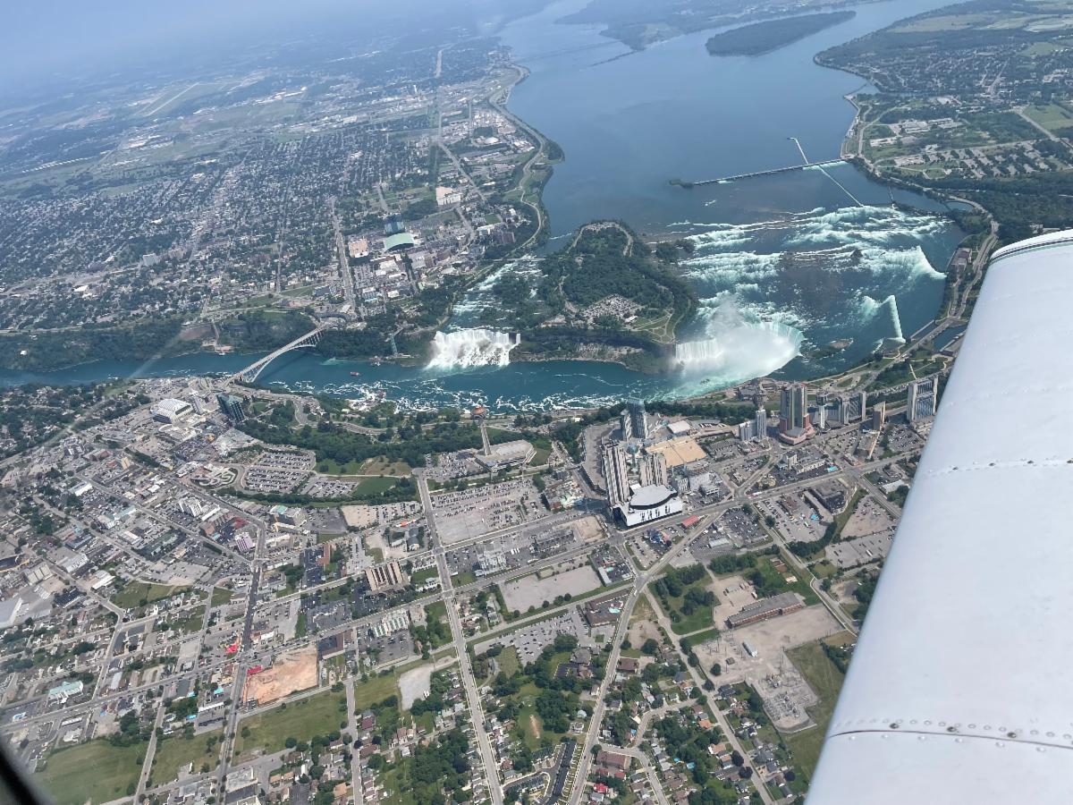 Private Pilot Beat Laemmle took a flight to Niagara Falls in a Piper PA-28 this summer. His route was from 39N to KIAG, Niagara Falls International. Total flight time there was about 3 hours. Prior to arriving to KIAG, Beat made four loops around the falls. (See photo)