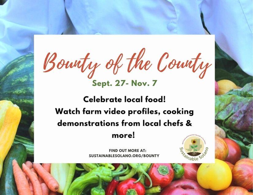 Sustainable Solano, a partner of the City's Community Sustainability Commission, will highlight the event with weekly videos, including cooking demonstrations by the chefs and farm profiles on Facebook and Instagram and on the Bounty of the County webpage.