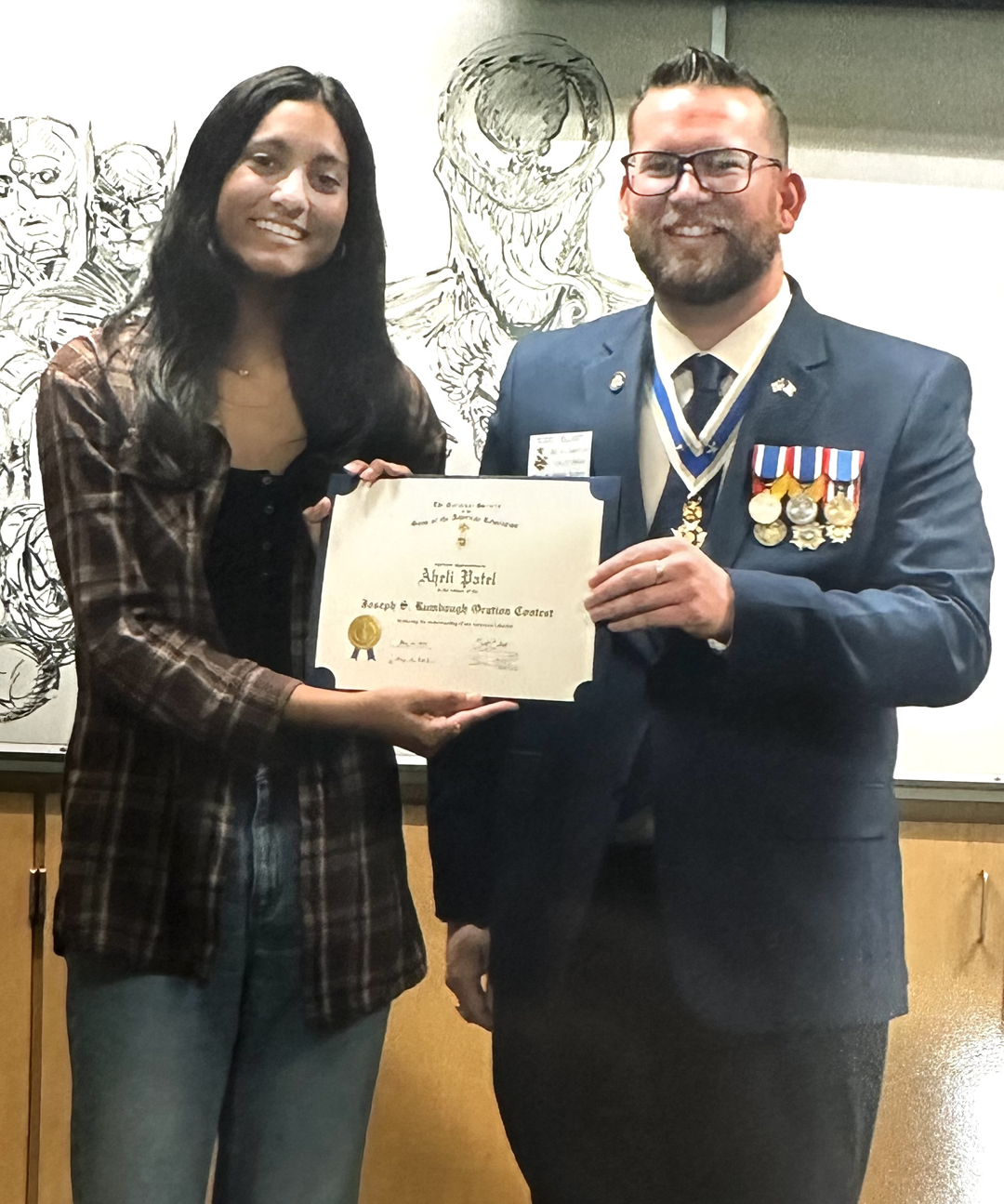 Delta Chapter President Rev. Scott Elliott was pleased to present Aheli Patel, with her check and certificate for winning the Joseph S. Rumbaugh Orations Contest for the California Society SAR. | |