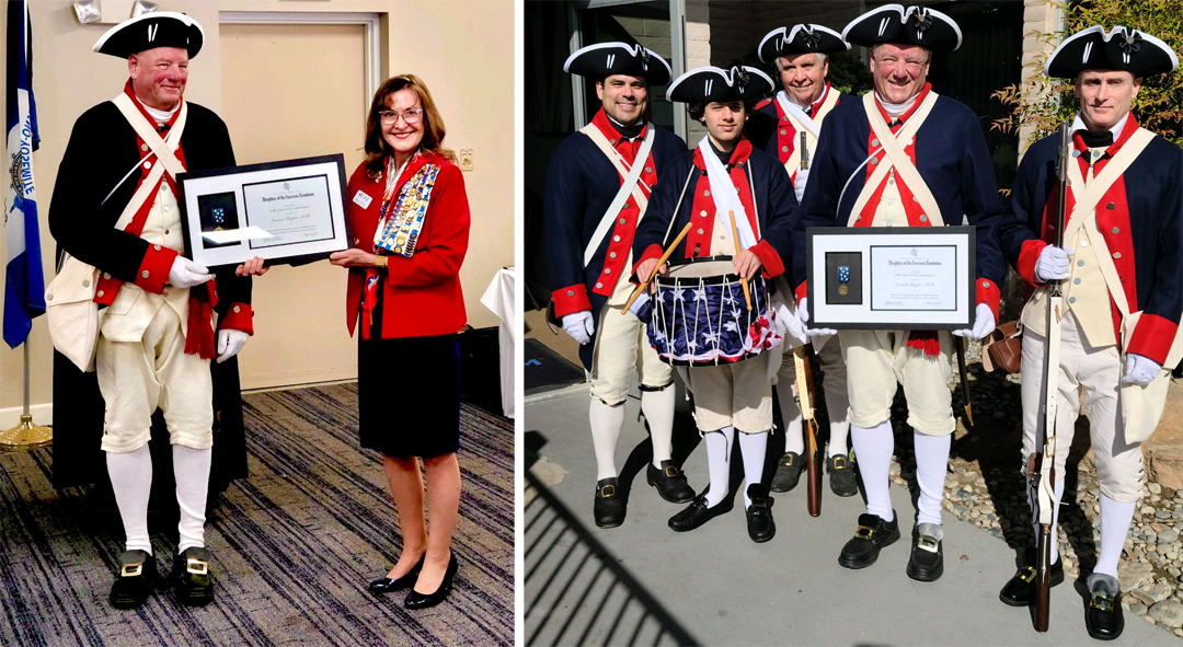 (Left) Yosemite Chapter President Scott Nichols being presented the DAR America 250 Commendation and Medal from Rebecca Malmo, Regent, Fresno-Yosemite Chapter, Daughters of the American Revolution. (Right) Yosemite Chapter Color Guard receiving the SAR America 250 Commendation & Medal. | |
