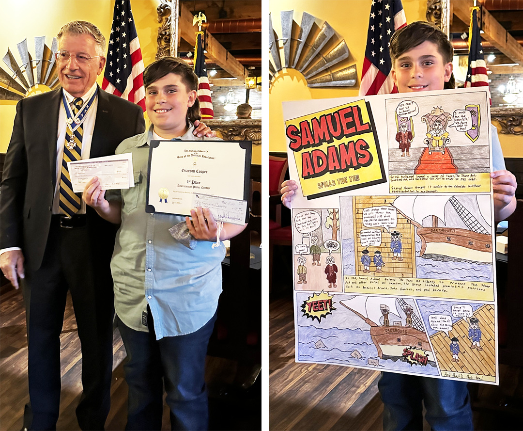 | CASSAR Executive Vice President Don Littlefield presented Grayson Cooper, a Fifth Grade student at Gold Ridge Elementary, Folsom, with his winning check from the Sacramento Chapter and his First Place check from the California Society. Grayson's poster will next be judged in Orlando at the SAR Congress. | Brandon Villardi, Chairman of the CASSAR Outstanding Chapter Recognition Program visited Sacramento in May and presented Sacramento Past President Russ Kaiser with the CASSAR Outstanding Chapter certificate for 2022. | |