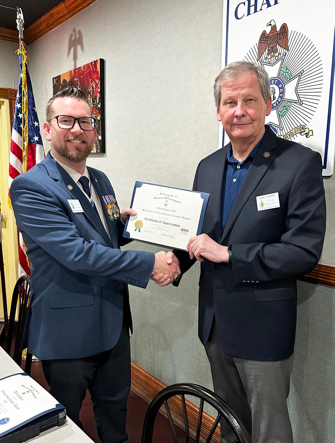 At the Delta Chapter meeting held on May 20, Chapter President Scott Elliott presented Gary Overby with a certificate from the National Society SAR for Delta Chapter's participation in Wreaths Across America at the San Juaquin National Cemetery, Justine, CA, on December 17, 2022.