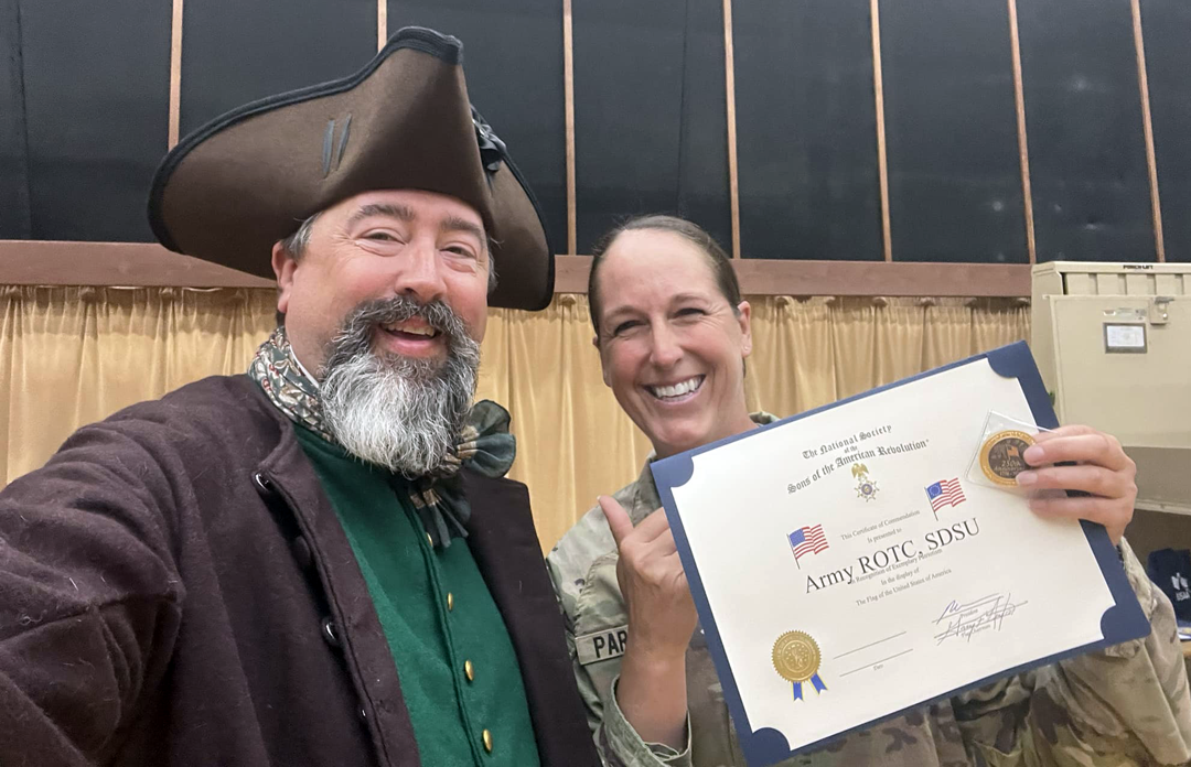 | Compatriot Michael Hirman presents an SAR Flag Certificate to the SDSU ROTC. | |