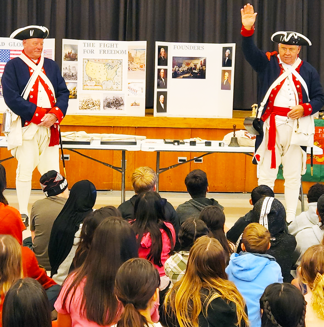 President Nichols and Compatriot Jim Riley present American Revolutionary War History lesson at Copper Hills Elementary School, Clovis, CA. | |