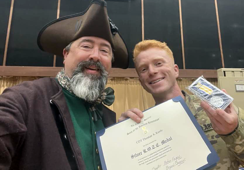 Compatriot Michael Hirman presented the SAR Silver ROTC Medal to San Diego State University Cadet Thomas Keefe (above right). | |