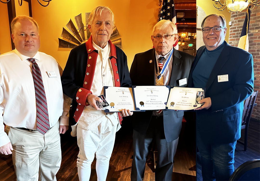 CASSAR Past President Craig Anderson presented America 250 Bronze Medals and certificates to Carl Ahlberg and Jon Wroten. In addition, Carl Ahlberg was also presented with his Silver America 250 Medal and certificate that was awarded at the CASSAR Annual Meeting. Carl Ahlberg chairs the Sacramento Chapter School Guard program.