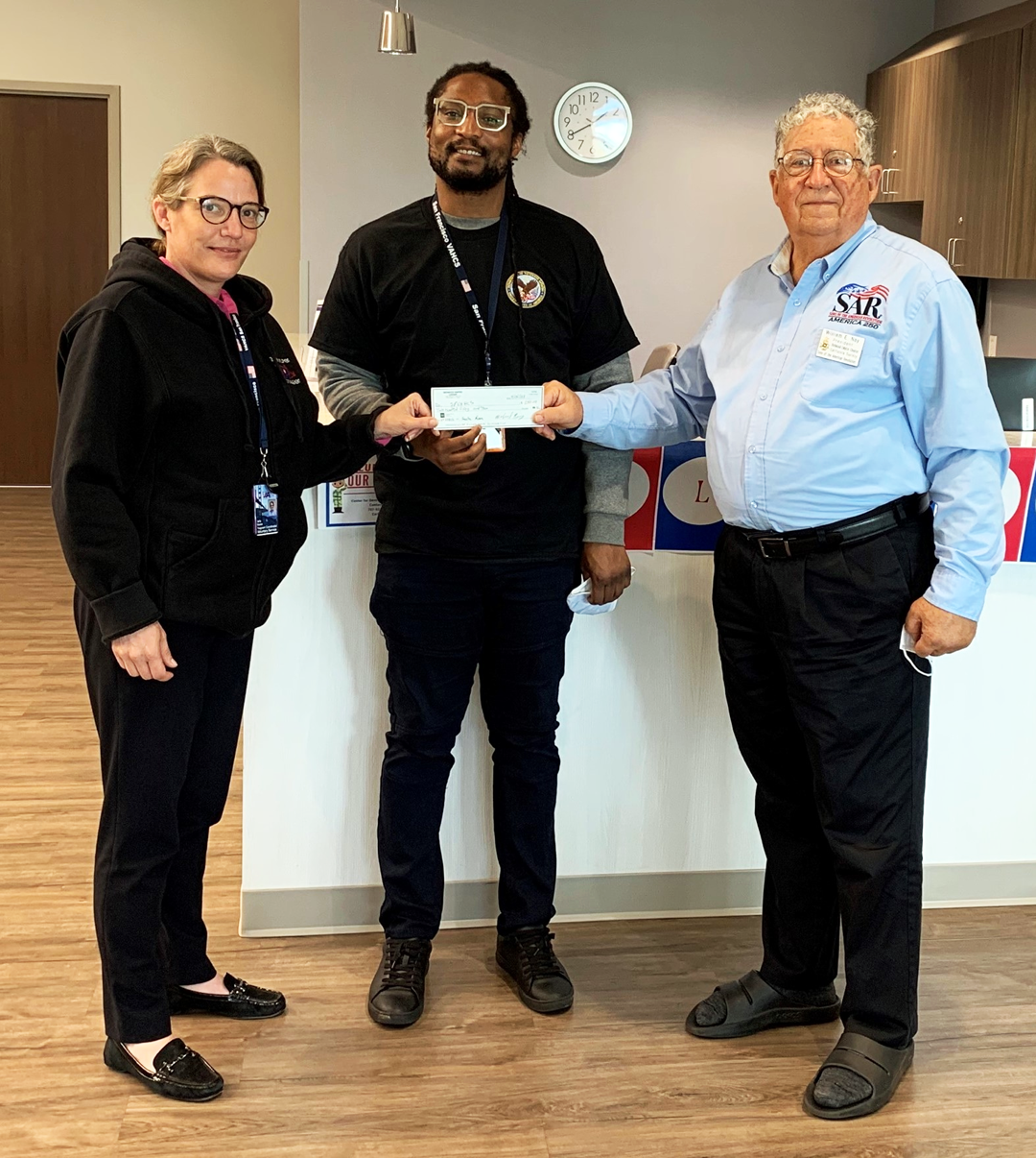 Redwood Empire Chapter Bill Nay visited the VA Clinic in Santa Rosa and presented Carly House (left) and Andre Scott (center) with a donation of $250.00 to support the Veteran Coffee Cart and other initiatives by the VA Community Development and Civic Engagement (CDCE) activities. | |