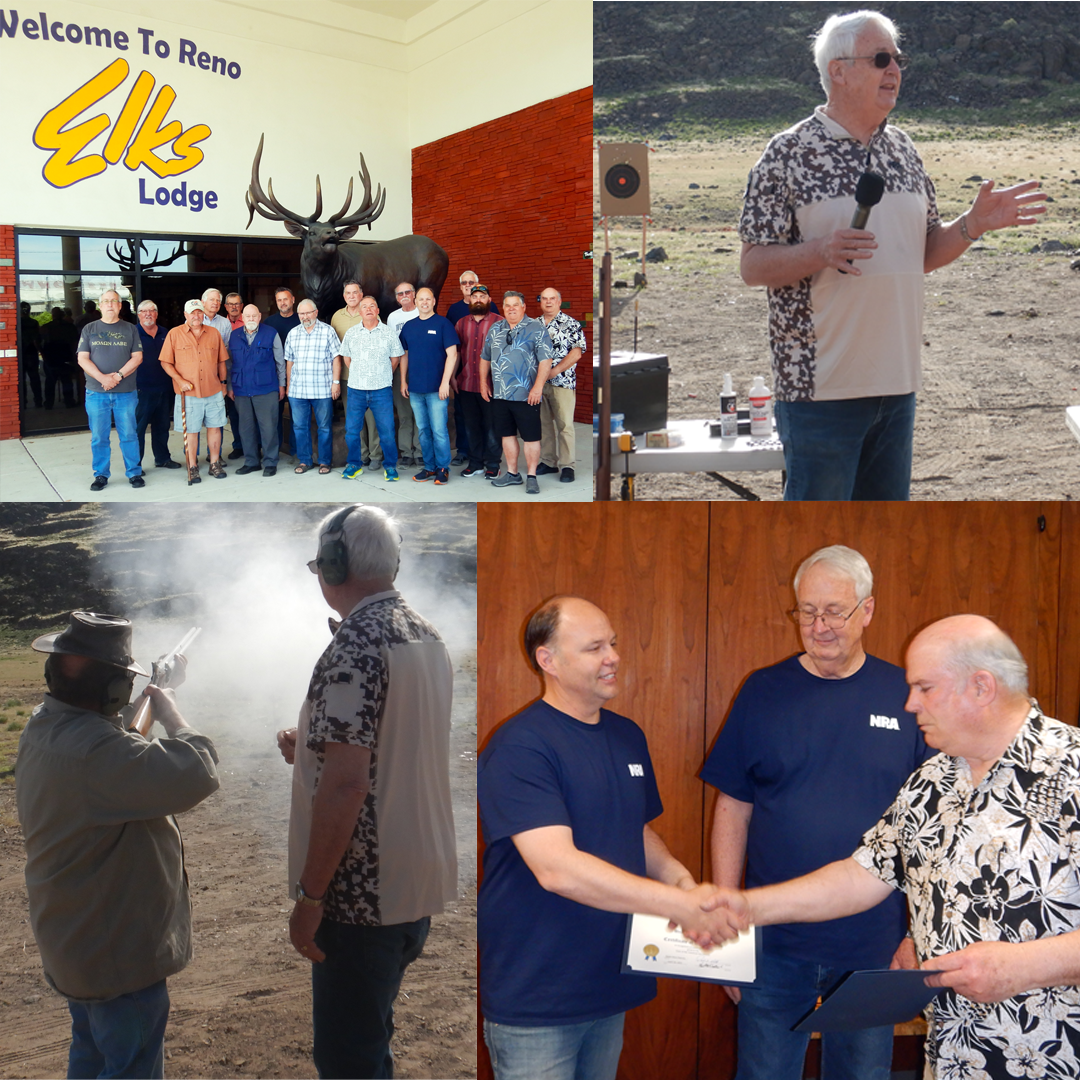 | | Clockwise above: Classroom students at Reno Elks Lodge, day one. Mark Kramer explains Range Rules, Golden Eagle Valley range. Instructors Mark Kramer and Brandon Villardi receive Certificates of Appreciation from R. Linscott (Battle Born Chapter SAR CG Commander. Compatriot Steve Hook firing percussion shotgun, monitored by Mark Kramer; Golden Eagle Valley range. Photos courtesy of Rafael Ortiz and Randall Lorenz. | |