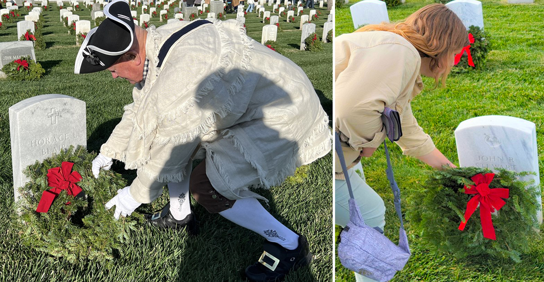 Compatriot Rob Welch (l) place a wreath at Fort Rosecrans National Cemetery and Kristine Reardon (r), San Diego Chapter wreath coordinator, places a wreath at